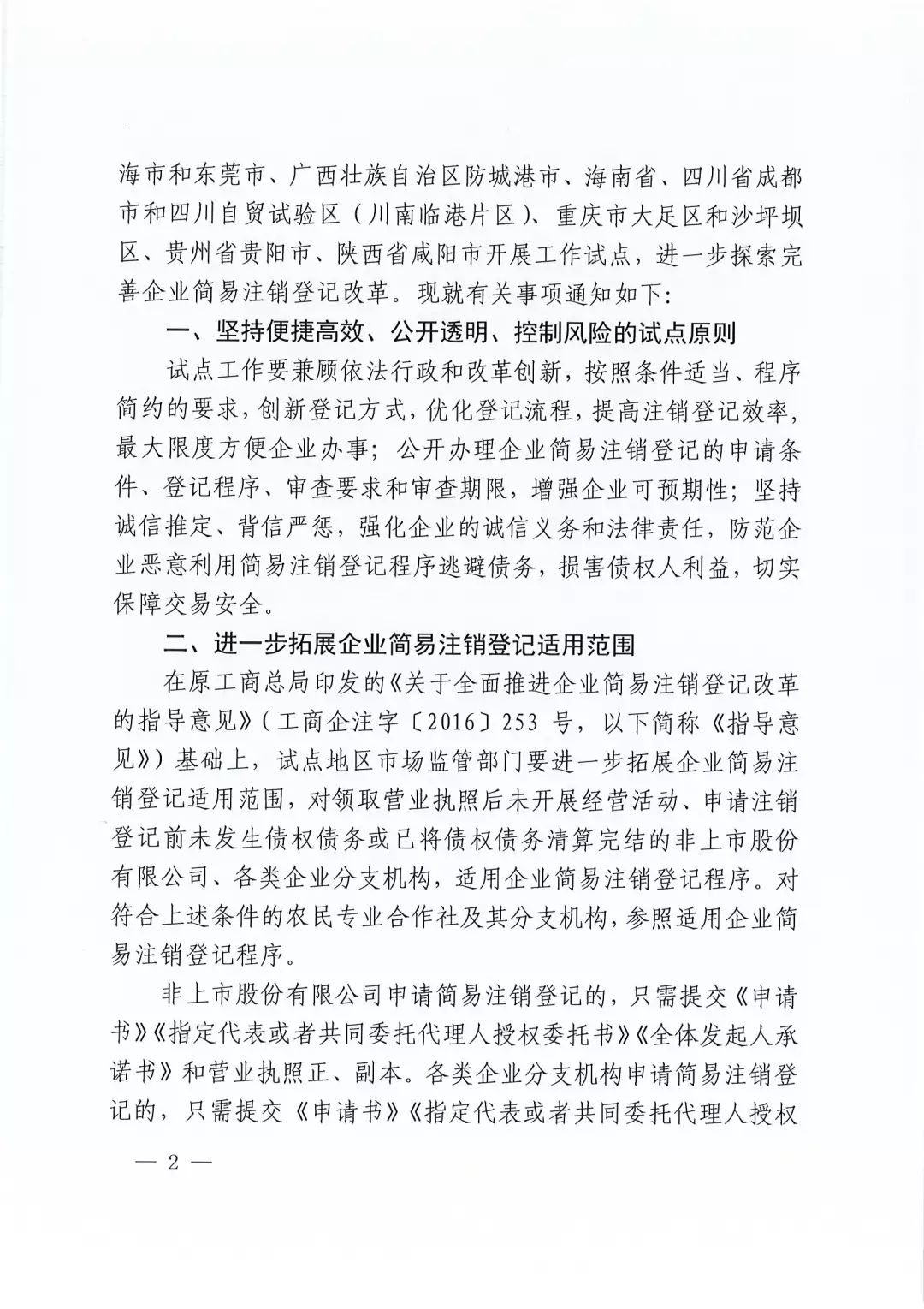 市場監(jiān)管總局關(guān)于開展進一步完善企業(yè)簡易注銷登記改革試點工作的通知(國市監(jiān)注〔2018〕237號)